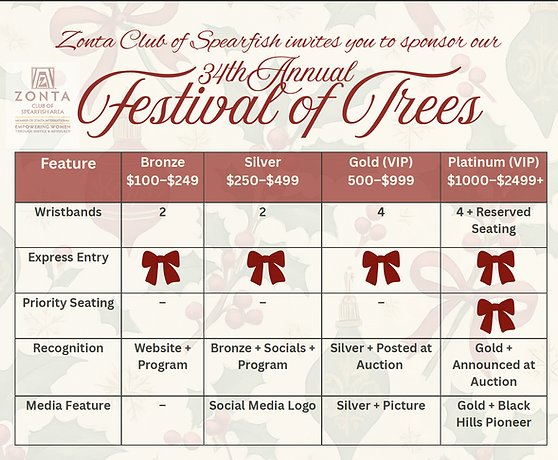 Every year Zonta Club of Spearfish hosts the Festival of Trees. This is a fundraiser to benefit Zonta and further empower and advocate for women and children through service.